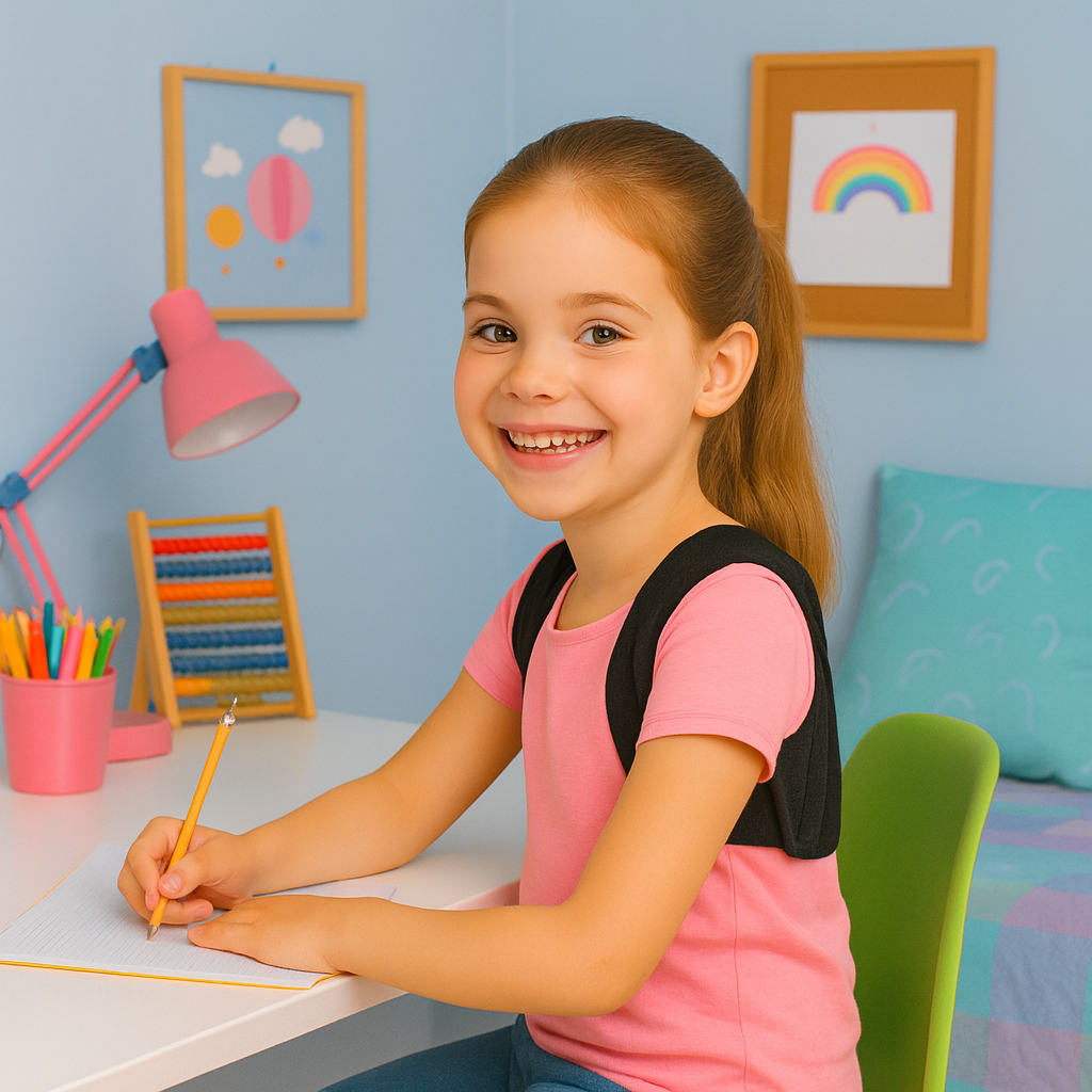 Al guiar la columna vertebral hacia una curva saludable y alinear los hombros, el corrector de postura enseña a los niños a sentarse y pararse más erguidos. Esto reduce la tensión en la espalda y los hombros, mejora la comodidad durante las actividades diarias y fomenta la confianza, ayudándolos a verse y sentirse más altos.